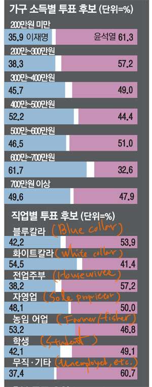 The first one is the candidate people (blue: Lee Jae-myung / red: Yoon Seok-yeol) voted for segmented by household income, from two million won ($1,640) a month to over seven million won ($5,750). The second one is segmented by job types.